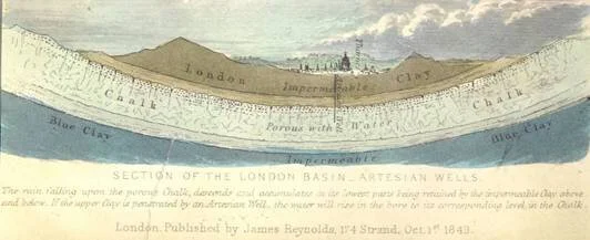 Not long after geology was discovered as a science two centuries ago it was realised that London was sitting on a chalk bowl full of clay. Our victorian ancestors dug wells into the chalk and fresh clean water gushed up from the great chalk sponge where the rain on the hills around London ended up trapped by more clay below. The same thick chalk that is broken clean into the sea cliffs by the English Channel at Dover.